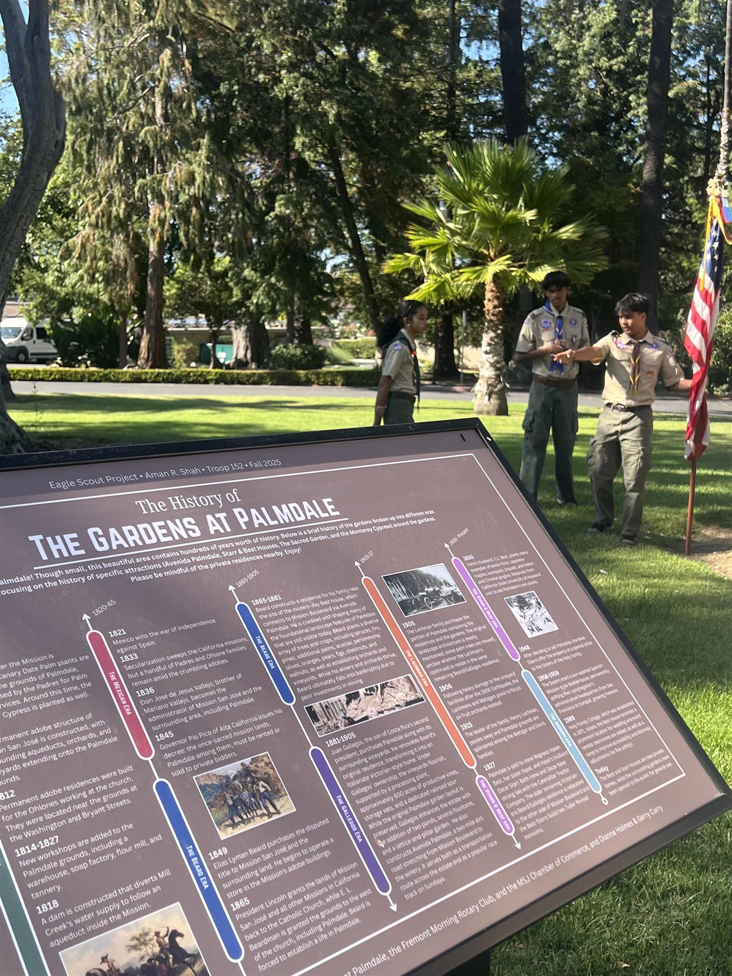Palmdale Gardens is a park located along Mission Blvd in Fremont, featuring large Cypress trees that are believed to have been planted about 200 years ago by the missionaries who founded the Mission San Jose nearby. The historical background of the garden became more widely recognized when Aman Shah, a member of Boy Scout Troop 152, undertook his Eagle Scout project to install five informational signs, each detailing the history of various park landmarks. Fremont Morning Rotary is proud to have provided a community grant to help bring this project to completion.